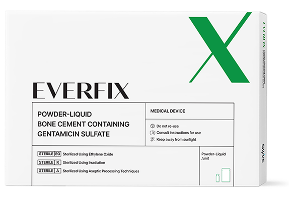 이번에 출시된 ‘에버픽스’는 인공관절 수술 시 임플란트를 뼈에 고정하는 데 사용되는 의료용 골시멘트다. 폴리메틸메타크릴레이트(PMMA)를 주성분으로 하며, 항생제인 겐타마이신황산염(Gentamicin sulfate)이 함유되어 있어 수술 부위의 미세한 공간에 발생할 수 있는 세균 증식을 억제하고 감염을 예방하는 핵심적인 역할을 한다.